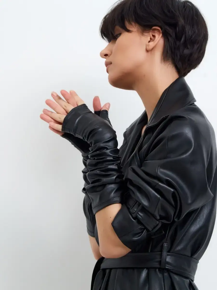Перчатки длинные женские без пальцев выполнены из качественной эко кожи торговой марки Nadia Piskun. Перчатки стильные, базовая модель. Длина изделия около 48 см Перчатки оригинально дополнены декоративной строчкой в верхней и нижней части перчаток..Перчатки идеальны как подарок на любой праздник.